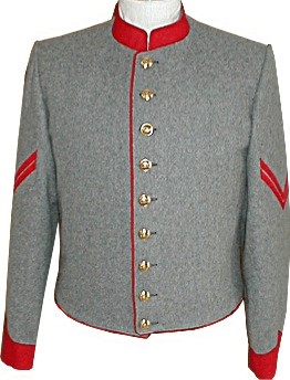 Early War Shelljackets#1 and #2 show the typical Early War Shell Jackets, each with optional Corporal stripes. Specifications for our Early War Jacket are as follows: Long waisted jacket, with branch of service colors on the collar, cuffs, and edge piping (piping runs down the front and around the bottom). The coat has a 9 button front with 2 small size button on each cuff. Other amounts of front buttons are available upon request The coat is lined with natural muslin and has an inside left breast pocket. Early War Shelljacket with EpauletsA variation of our Early War Jacket has shoulder straps, collar and cuff facings in the branch of service colors with the edge piping being dropped. Other variations of this jacket are available, please write supplying photos and documentation for quotation. All Early War Jackets are custom made, usual delivery is eight to ten weeks for custom orders. Other Variations of Shelljackets 1st Virginia Cavalry, 11th Mississippi Infantry