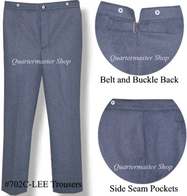 Matching Vest and Trousers are available in the additional order boxes below the coat order box. Vest is cadet grey wool with black polished back. Notched collar style with two front pockets and 8 small Conf Officer Eagle buttons supplied. Trousers are cadet grey wool with side seam pockets and a waistline watch pocket. Real bone buttons are supplied for the double button front pattern- suitable for our #1907 suspenders. Trousers are supplied unhemmed at 34.5" inseam for you to hem them the length you want. Or, we can hem them at your desired inseam for additional charge. Please double check your inseam. Trousers hemmed too short cannot be made longer!