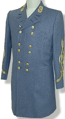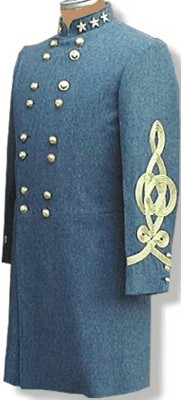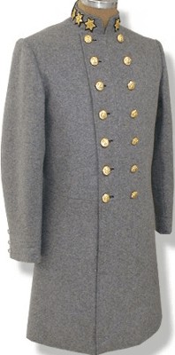 "The Surrender Uniform"Lee 1865 Frockcoat: This uniform is copied from the original Lee uniform located at the Museum of the Confederacy in Richmond Virginia. It is called "The Surrender Uniform". The coat was made from imported English cloth at the direction of Maj. J. B. Ferguson. The color is Cadet Grey. Eye witness accounts of the Surrender mention that Lee was resplendent in a NEW full dress uniform. Three small buttons and four rows of intricately woven gold Flat braid adorn the sleeves. No trim colors are used on the uniform. The collar is a civilian laydown style and has the regulation Wreath and Stars embroidered directly on the collar- not a separate badge. Confederate Officer Eagle buttons are supplied for the front in the General's button pattern- four sets of 2. Our reproduction is made in Cadet Grey wool and has a Black Polished Cotton lining with natural cotton sleeve lining. Back Pockets with flaps in the folds of the skirt. Skirt is left raw- typical in those days. Because this is an exact reproduction of one specific uniform, we can't offer any changes from the original. Because the embroidered collar must be custom ordered from overseas, please allow 12 weeks for delivery.