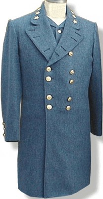 "The Maryland Uniform"Lee Maryland Frockcoat: This uniform is copied from Lee's original coat now located at the Maryland Historical Museum. It was presented to General Lee by Southern sympathizers from Baltimore, Maryland in 1863. The coat is a medium shade of true grey. Collar and cuffs were plain without trim color. Sleeves have a split cuff but are tube style (non-functional). Sleeve Braid was not used. The collar has three SIX pointed stars without the wreath surrounding the stars. This would typically be considered the frockcoat of a full Colonel. Maryland State seal buttons are supplied for the front in the standard Colonel's arrangement of 7 individual buttons on each side. Our reproduction is made in the Medium Grey wool and has a Brown Polished Cotton lining with natural cotton sleeve lining. Back Pockets with flaps in the folds of the skirt. Skirt is left raw- typical in those days. Because this is an exact reproduction of one specific uniform, we can't offer any changes from the original.